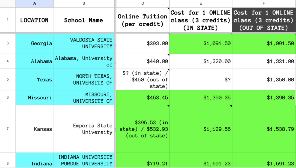 Prior to starting library school, I wanted to ensure that I found the most affordable option that still met my education goals. I went through the ALA website and visited the website for every university listed as ALA Accredited. I researched every single program to determine the number of credit hours and estimate the cost of the entire degree for each one. I then expanded to estimate the tuition for a variety of in-state and out of state circumstances, so that the information could be shared with other potential LIS students.